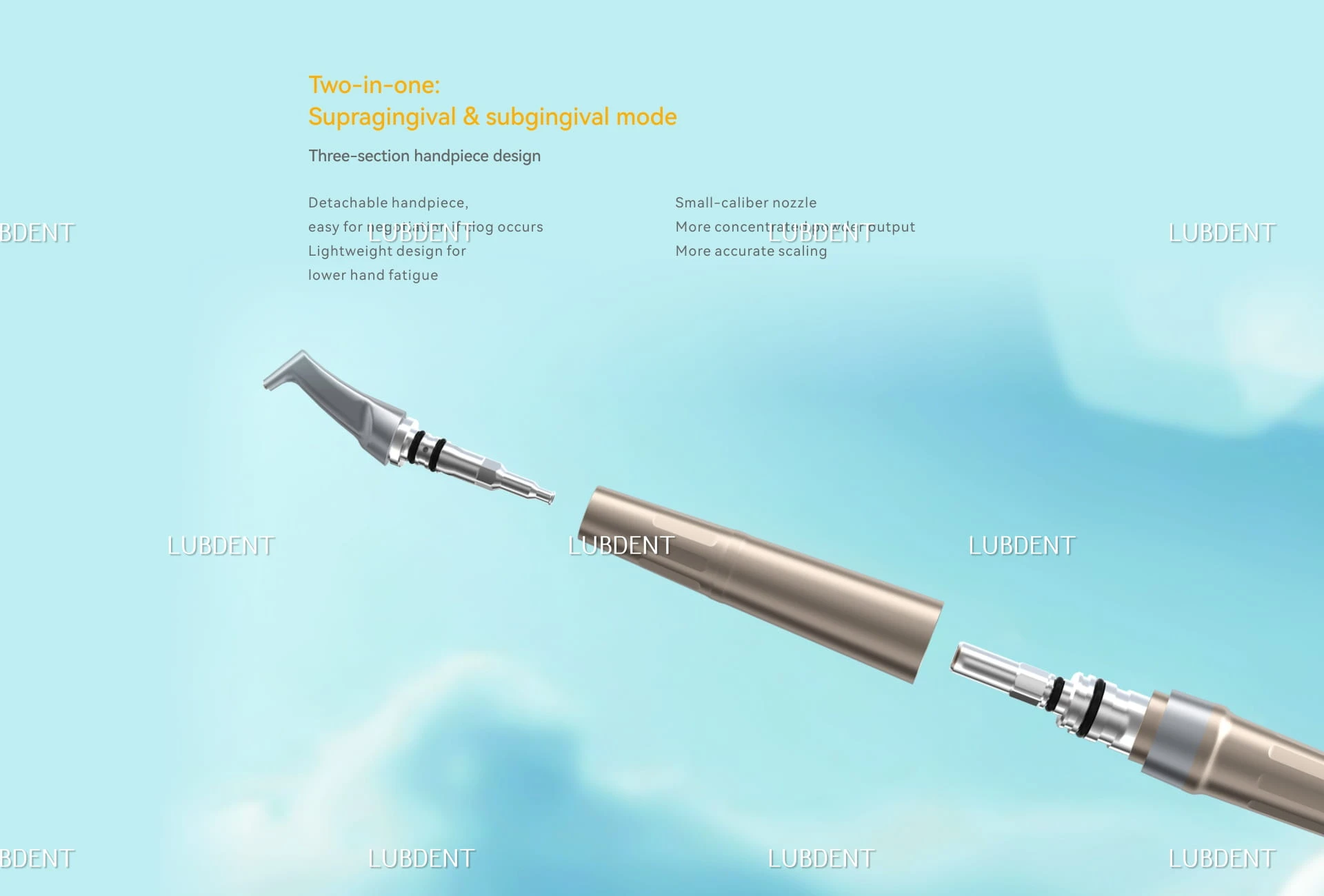 W zestawie dwie rączki: AP-1 do skalingu naddziąslwego z dyszą i AP-2 do skalingu poddziąsłowego z wymiennymi dyszami ( w zestawie 10 szt.)