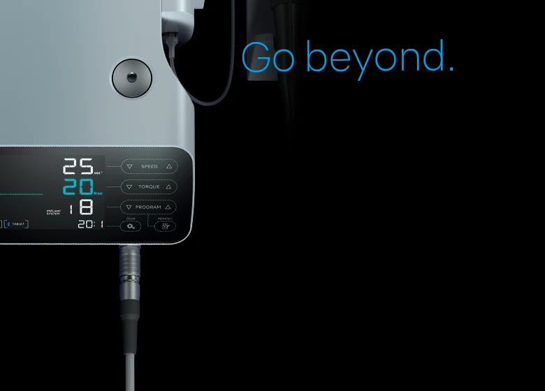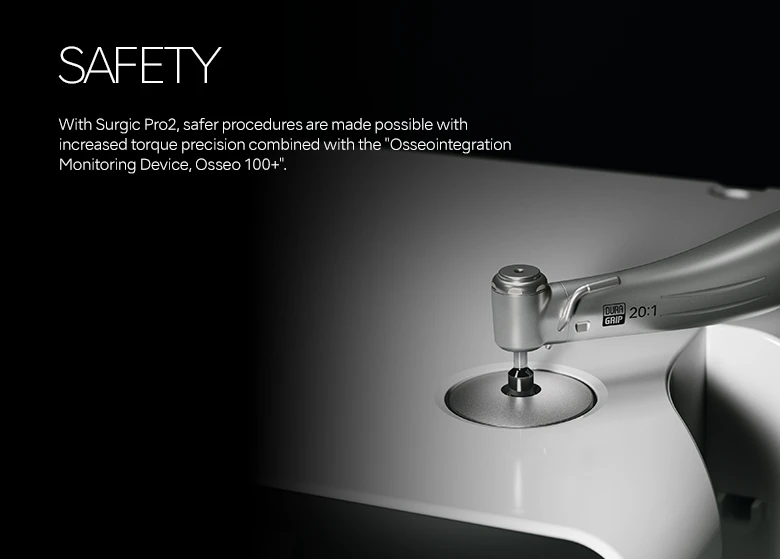Synonimem Surgic Pro2 jest, bezpieczeństwo zapewnione dzięki zwiększonej precyzji momentu obrotowego, w połączeniu z urządzeniem monitorującym osteointegrację, +. Wyświetlana dokładność wartości momentu obrotowego zależy od stanu łożysk rękojeści i stopnia zużycia przekładni.
