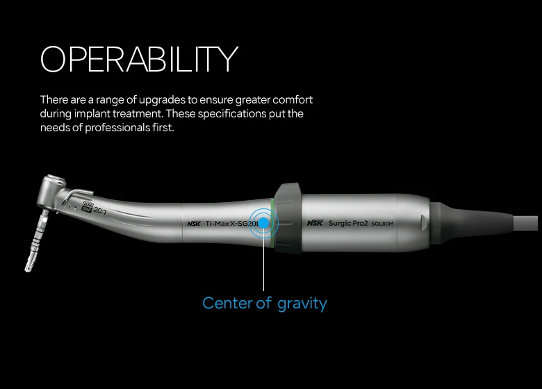 Surgic Pro2 tak jak i jego poprzednik posiada mikrosilnik bezszczotkowy przystosowany do pracy z pełną gamą końcówek zwalniających i przyśpieszających, nadających się do sterylizacji w autoklawie.