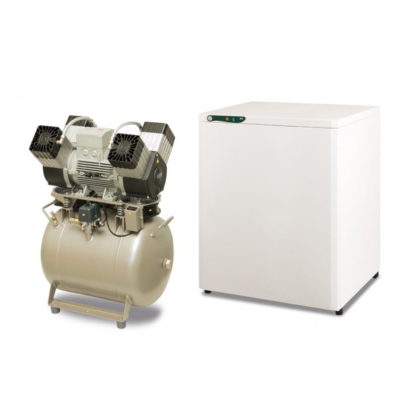 Bezolejowy kompresor EKOM serii DK50 4VR/50 jest źródłem czystego, ciśnieniowego powietrza przeznaczonym do napędu sprzętu i urządzeń stomatologicznych. Swoimi parametrami oraz wielkością zbiornika 110 litrów nadaje się do zasilania urządzeń w laboratoriach dentystycznych lub kilku unitów stomatologicznych. Powietrze produkowane przez bezolejowe kompresory, zapewnia wyższy poziom higieny i jakości prac dentystycznych i nie zanieczyszcza środowiska pracy substancjami obcymi. Kompresory są produkowane w 110 litrowym zbiorniku w wersjach z jednym, lub z dwoma 2V agregatami. Mogą pracować w trybie ciągłym.