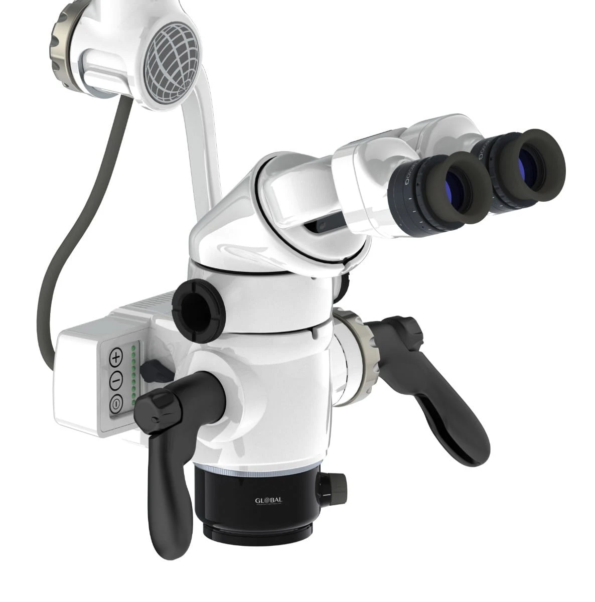 Bardzo jasne, bezcieniowe oświetlenie LED o regulowanym natężeniu do 100 000 lux – temp. Barwowa równa temperaturze światła dziennego (5700K) zapobiega męczeniu się wzroku. Najwyższej jakości apochromatyczna optyka produkowana przez firmę Global zapewnia wysoką jakość widzenia opatentowany system Axis ControlTM zapewniający intuicyjną i ergonomiczną obsługę mikroskopu. Brak drogiego i wrażliwego na uszkodzenia światłowodu – źródło światła montowane w głowicy, 3 stopniowe powiększenie, brak widocznych przewodów i dodatkowych pokręteł – łatwość utrzymania czystości.