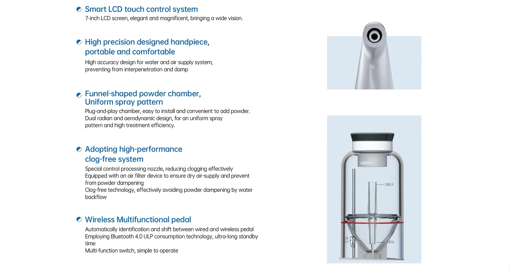 - Odłączane rękojeści do skalingu i piaskowania, sterylizowane w temperaturze 134°C.