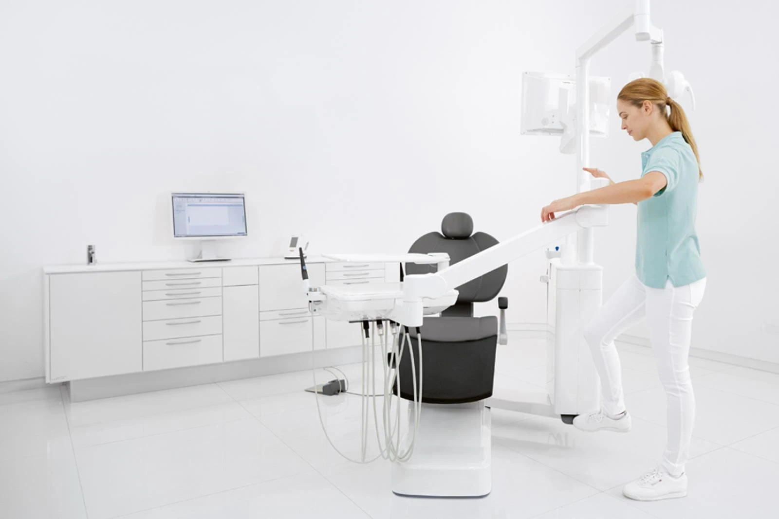 Ergonomiczna regulacja pozycji konsoli lekarza dzięki dużemu zakresowi zasięgu ramienia podtrzymującego. Funkcjonalna konsola z odłączaną tacą, której pozycję można wygodnie regulować.
