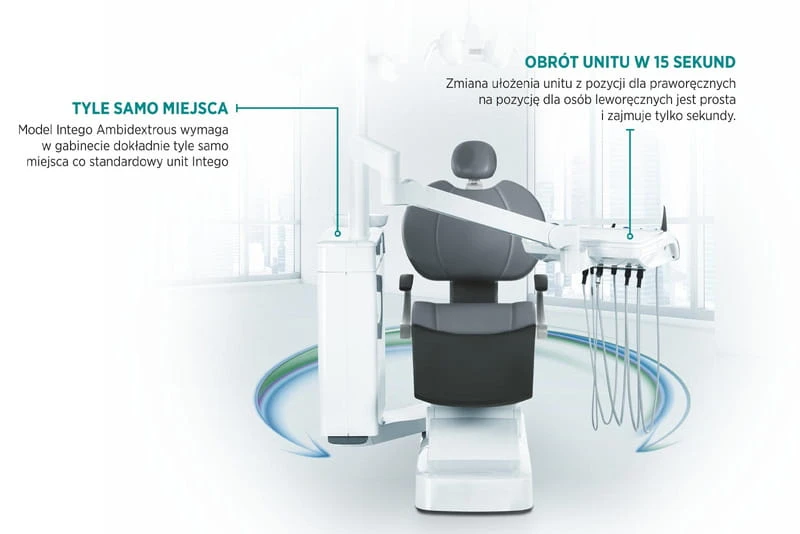 Unit Intego Ambidextrous został zaprojektowany właśnie dla Ciebie. Unikalna konstrukcja mechanizmu obrotowego unitu umożliwia szybkie, wygodne i niezwykle łatwe ustawienie unitu do potrzeb osób leworęcznych i ich wygodnej pracy. Zmiana ustawień unitu z pozycji osoby praworęcznej do idealnej dla osoby leworęcznej zajmuje jedynie 15 sekund. Ergonomiczna konstrukcja unitu ułatwia pracę lekarza i asysty oraz zapewnia komfort pacjentom.